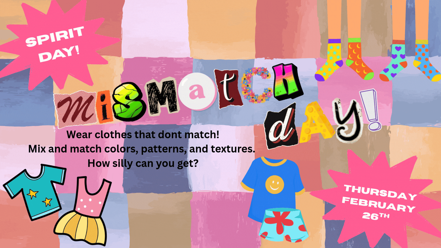 ASB Mismatch Day Thursday, 2/26/2026 Wear Clothes that don't match! Mix and match colors, patterns, and textures. How silly can you get? Show your school spirit !!!!
