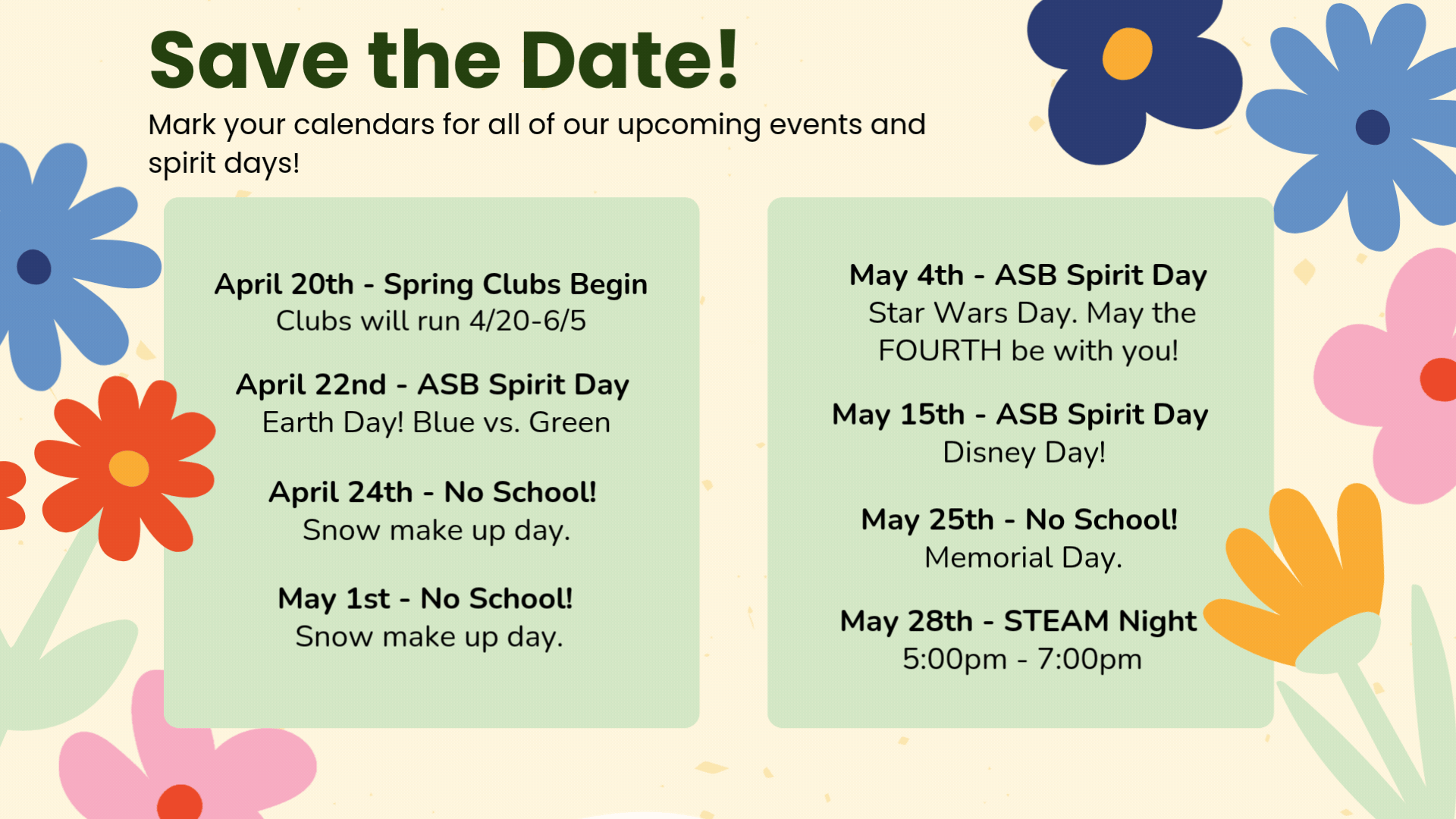 🗓️ SAVE THE DATE! Upcoming events and ASB spirit days you may want to mark on your calendars.